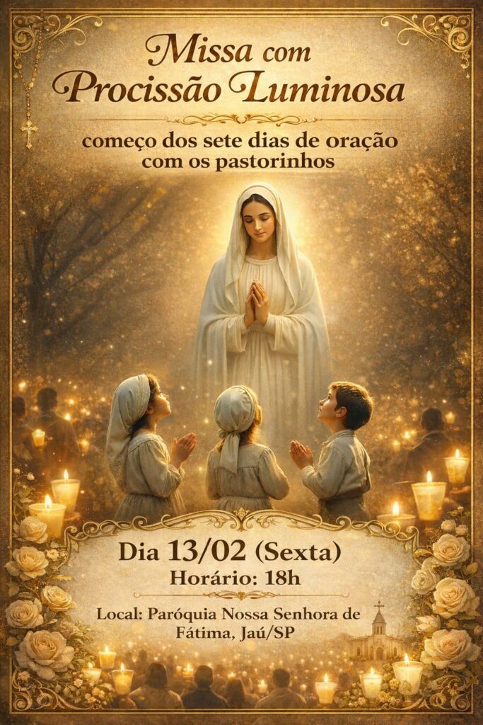Ao término da celebração, realizaremos a Procissão Luminosa pelas ruas da paróquia, um momento de profunda espiritualidade e beleza, no qual, com velas acesas, manifestaremos publicamente nossa fé e nossa devoção a Nossa Senhora de Fátima.